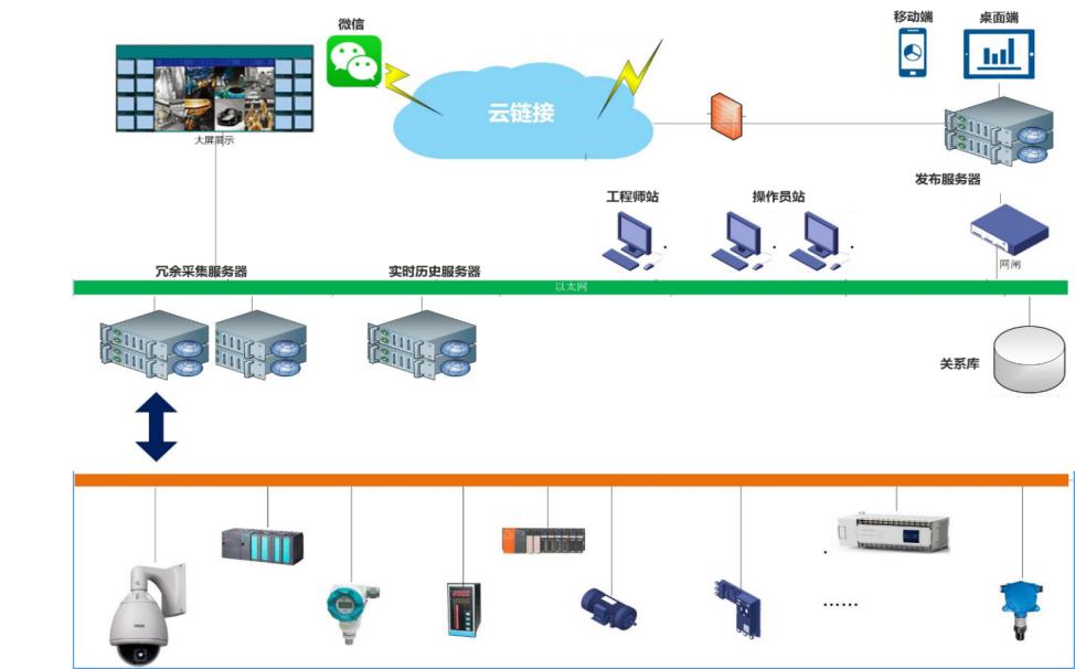 綜合監控層:部署數據庫軟件和SCADA軟件,把傳輸到中心端的數據通過計算和存儲為生產安全提供有力的數據支撐,通過實時/歷史數據可以對各子系統的安全生產狀況進行綜合性動態分析,為科學決策提供依據。管控一體化平臺的建設,將有助于各級管理人員、技術人員及時準確了解現場設備生產運行所需的各類信息,可通過調度中心的大屏、各個子站的運行客戶端、遠程用戶可通過WEB發布方式進行遠程瀏覽訪問現場設備運行數據信息。