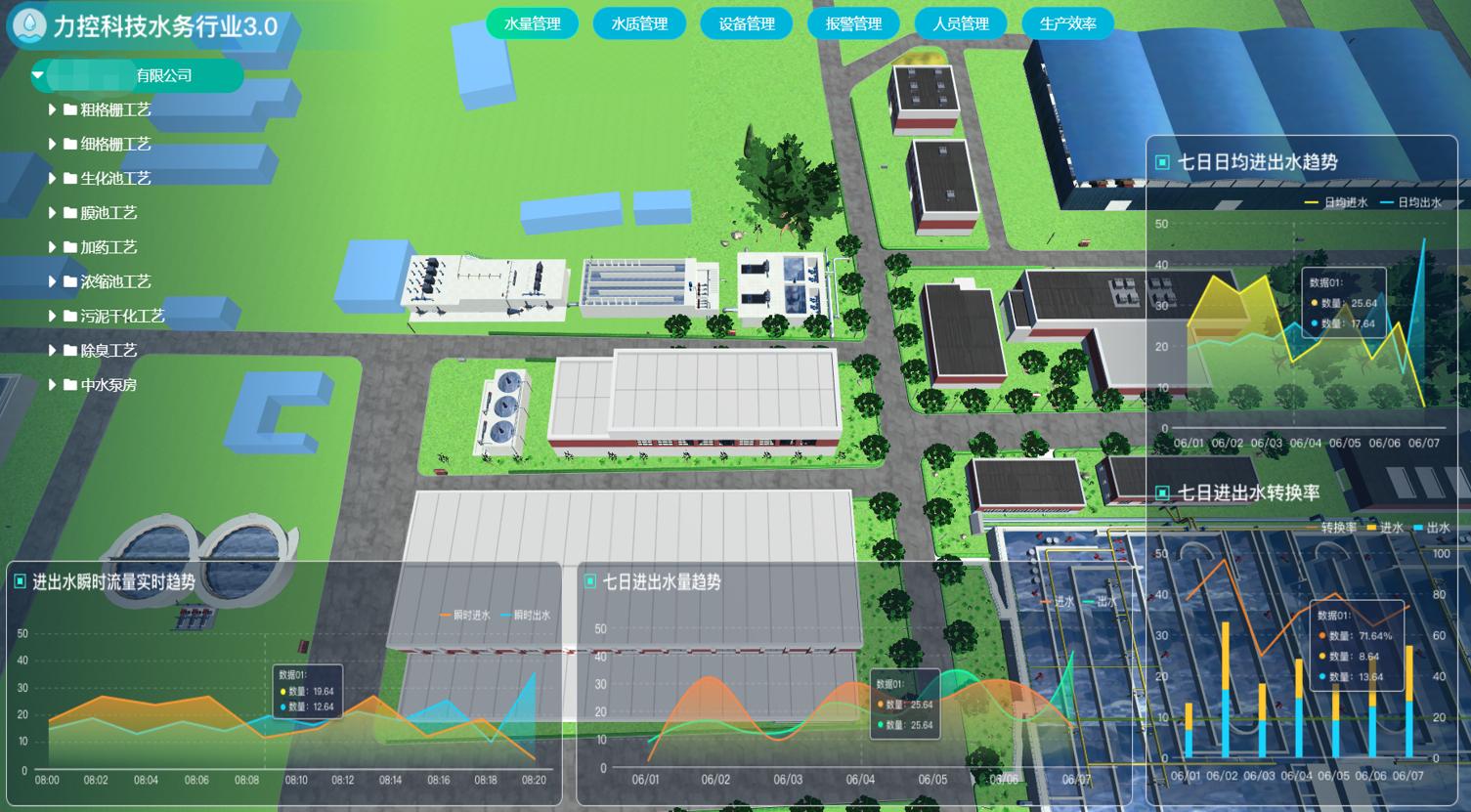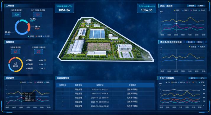 直觀展示廠區(qū)生產運行情況,如進出水當日流量,進出水相關水質參數(shù)對比(化學需氧量、生物需氧量、氨氮、總氮、懸浮物、總磷),設備類型統(tǒng)計、報警信息統(tǒng)計、用藥趨勢、流量趨勢、進出水壓力趨勢、液位趨勢等重點關注信息。