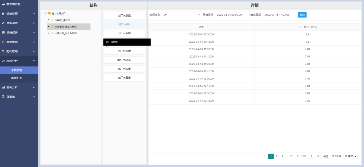 選擇水質參數(shù)、自定義查詢時間,查詢所選水質參數(shù)的歷史數(shù)據(jù)信息。