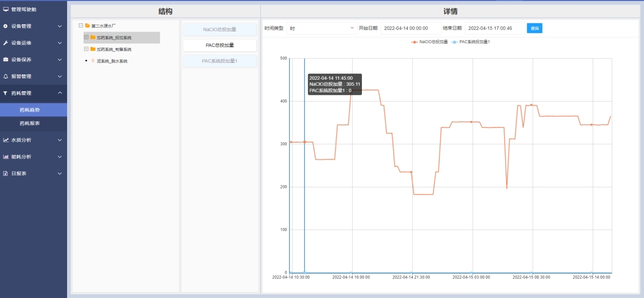 樹型結構展示測點的整體結構,基于樹型結構選擇藥耗測點,基于藥耗測點、起止時間,查詢藥耗的歷史趨勢。