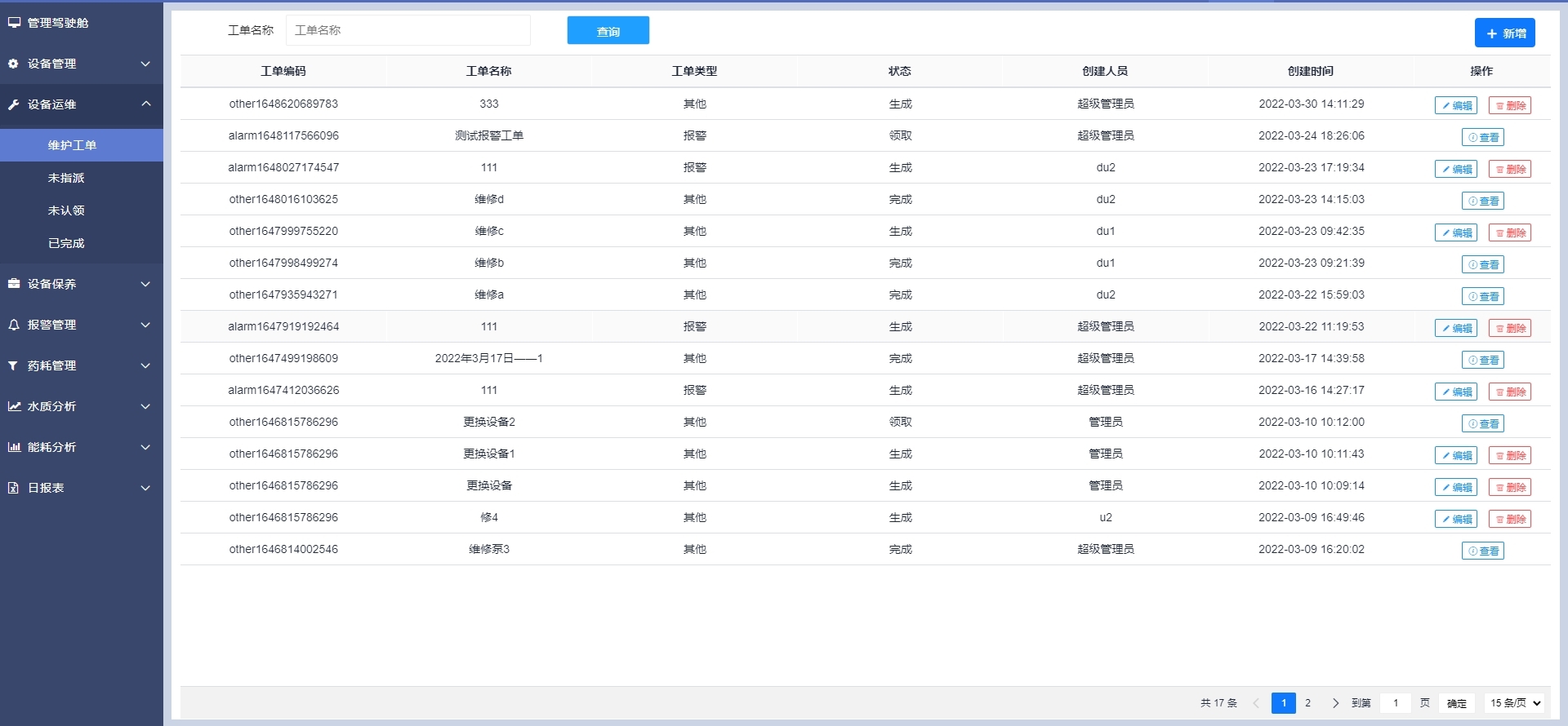 以列表形式展示工單信息,可對工單進行新增、查看、刪除、編輯等操作。