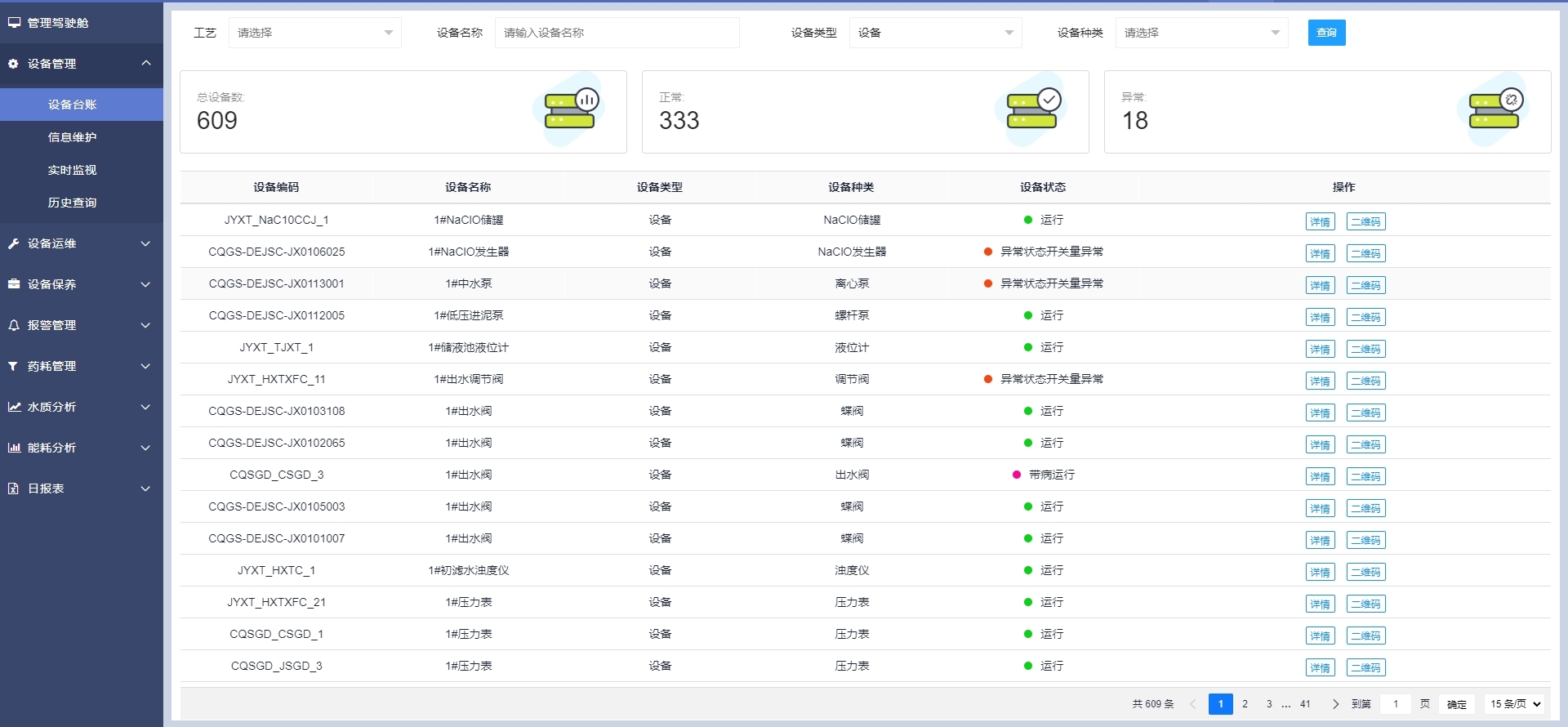 設備列表包含設備編碼、設備名稱、設備類型、設備種類、設備狀態(tài)、單臺相關操作(查看設備詳情)二維碼。