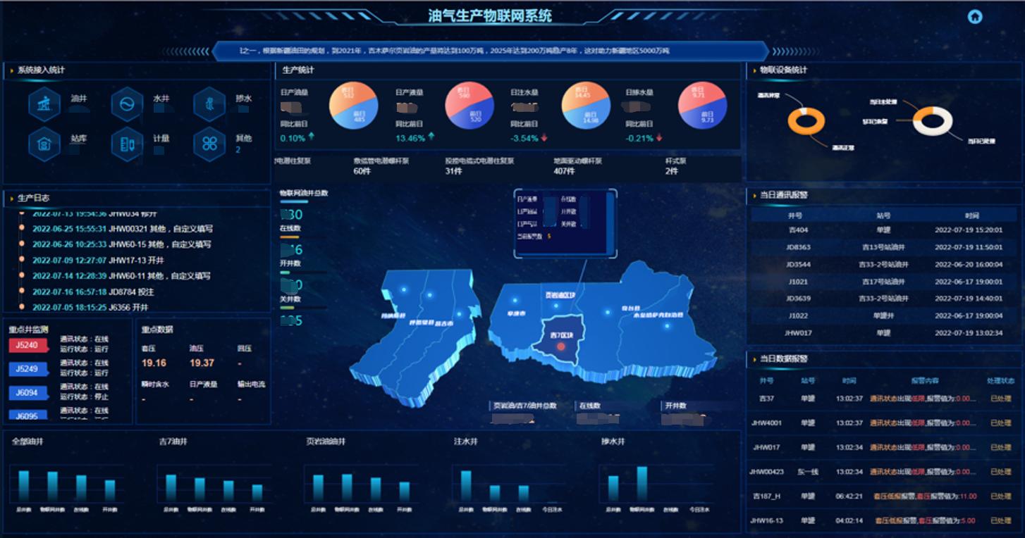 基于基礎數據的收集,將信息數字化呈現。對油井、注水、摻水、計量、站庫、輸油的所有控制參數、測量參數進行實時監測,分析生產系統各部位的運行狀態。此外針對每個生產環節,重要裝置,系統提供精細化的數據實時監控;使平臺管理者和具體操作人員無需實時巡視現場也可清晰準確獲知現場工況信息。