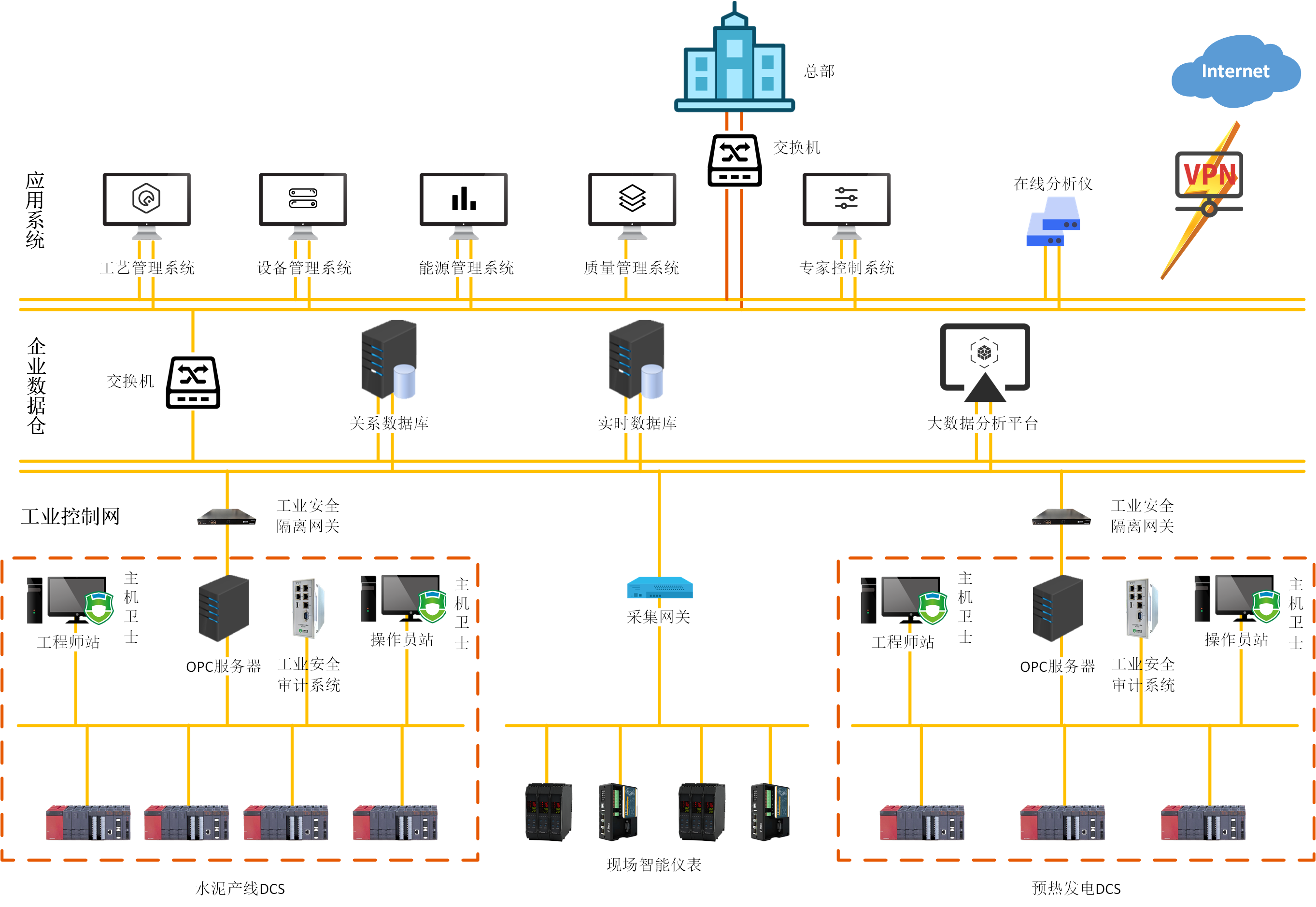 金隅水泥在運營中已經(jīng)應(yīng)用分布式控制系統(tǒng)(DCS)和信息管理系統(tǒng)(MIS),屬于工控自動化系統(tǒng)。因水泥企業(yè)的規(guī)模和產(chǎn)能不一,網(wǎng)絡(luò)建設(shè)情況也不同,不同情況存在分布式網(wǎng)絡(luò)結(jié)構(gòu)、環(huán)網(wǎng)結(jié)構(gòu)及虛擬化系統(tǒng)等。