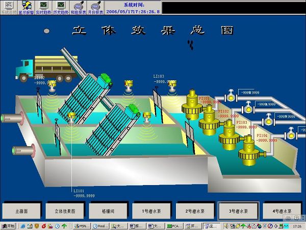 力控監控組態軟件集控制技術、實時數據庫技術、網絡技術、人機界面技術、圖形技術于一身,包含動態顯示、報警、控件、趨勢、網絡通訊等組件,用戶只需編寫少量代碼即可生成高質量的控制系統。整套系統建設有多幅實時監控畫面,包括系統總貌、提升泵站與除砂池、1#氧化溝、2#氧化溝、二沉池、泥路、加藥脫水間。其通過指示燈表明設備運行狀態。在電機運行方式為手動時,用鼠標點擊畫面下排電機啟動按鈕可遠程啟動現場設備。傳感器的瞬時值依據實際安裝位置被分別標注到不同的分布工藝流程圖中,其實時數據和歷史數據被做成相應分布圖的子畫面,可在分布工藝流程圖中直接點擊按鈕進入。整個軟件界面呈樹狀排列,查閱、操作簡便。數據庫是上位機監控軟件的核心所在,因此依據實際需要首先將其建設好,然后將各功能模塊進行恰當的組合。實際編程過程中在定義變量時,記錄可設定為不記錄、數據變化時記錄和定時記錄,要根據實際情況選擇相應的設置,從而節省存儲空間。報表分為實時報表和歷史報表兩種。
