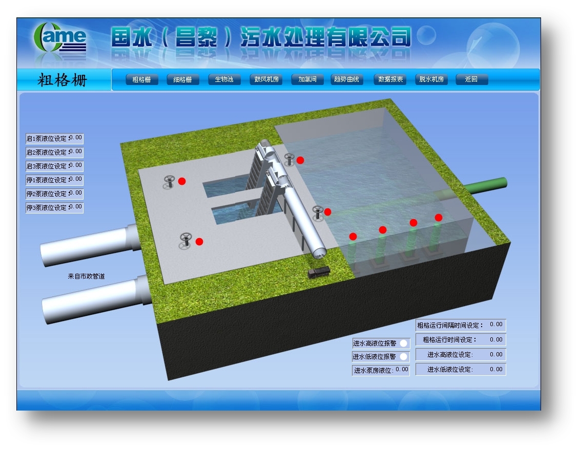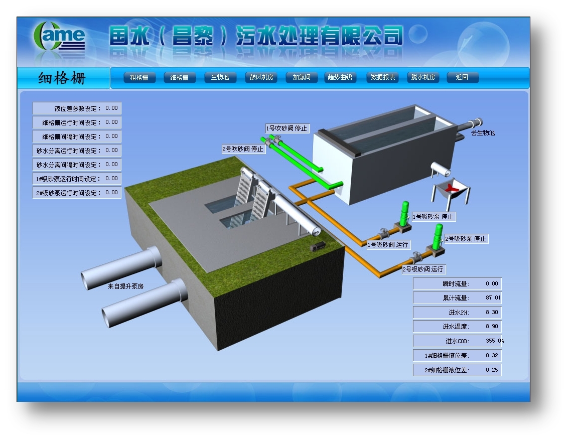 爬式粗格柵,進(jìn)水經(jīng)過粗格柵間過濾一些大的固體雜質(zhì),去除那些可能對(duì)水泵有影響的無機(jī)物。需要監(jiān)測(cè)格柵水位差、進(jìn)水流量、進(jìn)水酸堿度、進(jìn)水COD、提升泵狀態(tài)等參數(shù)。