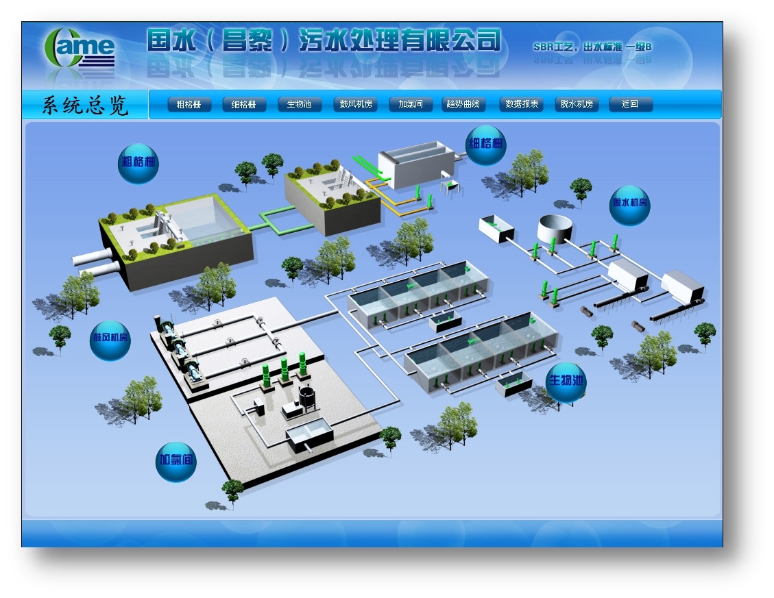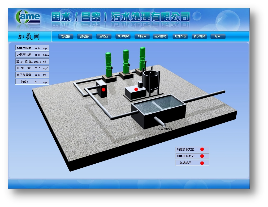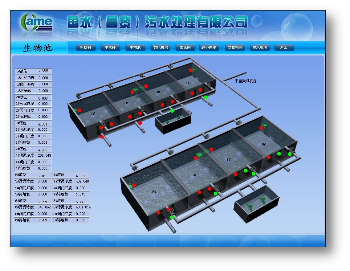 系統(tǒng)以美觀、友好的界面顯示設(shè)備運(yùn)行狀態(tài)、流量、水位、COD、超聲波液位計(jì)、溶解氧計(jì)、氧化還原電位計(jì)、污泥濃度計(jì)、電磁流量計(jì)等數(shù)據(jù),并以仿真圖、直方圖、曲線圖和棒圖等多種方式清晰直觀地顯示各個(gè)敏感數(shù)據(jù),方便用戶對(duì)各敏感數(shù)據(jù)進(jìn)行歷史查詢和對(duì)比分析。