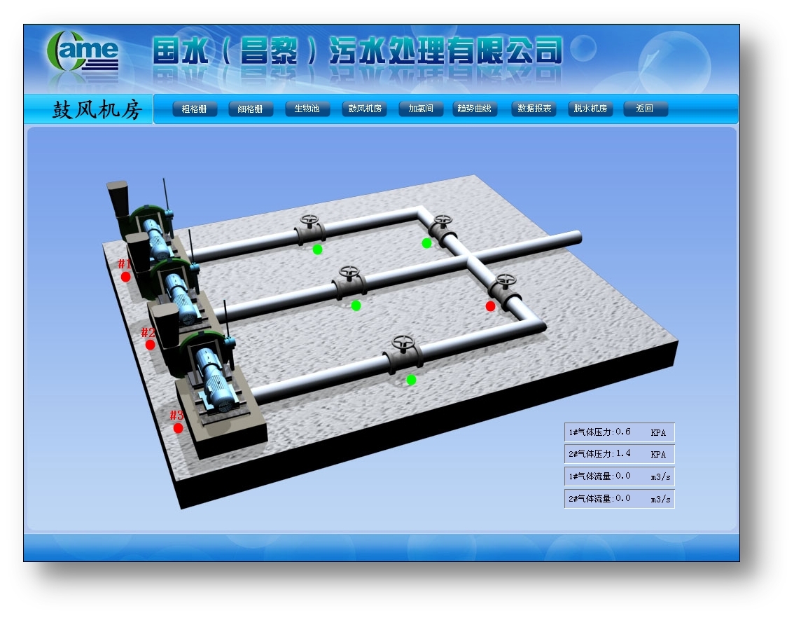 鼓風(fēng)機(jī)房負(fù)責(zé)對(duì)反應(yīng)池進(jìn)行鼓風(fēng)曝氣,該鼓風(fēng)機(jī)房設(shè)置3臺(tái)鼓風(fēng)機(jī),兩用一備。需要檢測(cè)閥門、鼓風(fēng)機(jī)狀態(tài)等參數(shù)。
