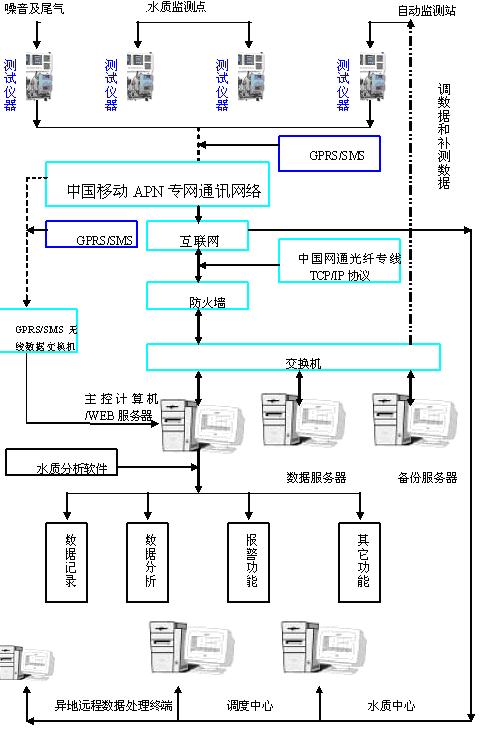 在水質自動監測系統網絡中,中心站可以通過無線GPRS/CDMA技術、衛星、電話撥號等多種通訊方式實現對各子站實時監視、遠程控制及數據傳輸的功能;托管站也可以通過以上方式實現對所托管子站實時監視、遠程控制及數據傳輸的功能;其他經授權的相關部門可通過相關方式實現對相關子站實時監視和數據傳輸的功能。