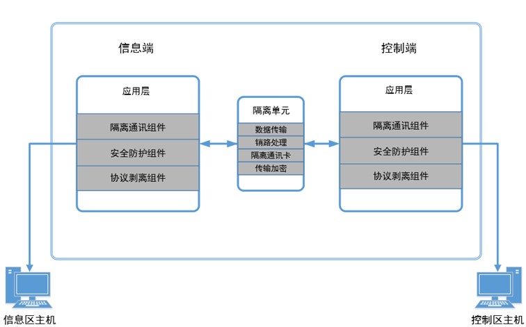 “2+1”隔離技術架構由兩個獨立主機系統組成,一端的主機系統為控制端,用于連接控制網絡。另一端的主機系統為信息端,用于連接信息網絡。兩端主機均采用高性能嵌入式硬件,主板上各有多個以太網接口用來連接要隔離的兩個網絡,兩端主機通過隔離裝置進行連接,保證數據交互的安全性。