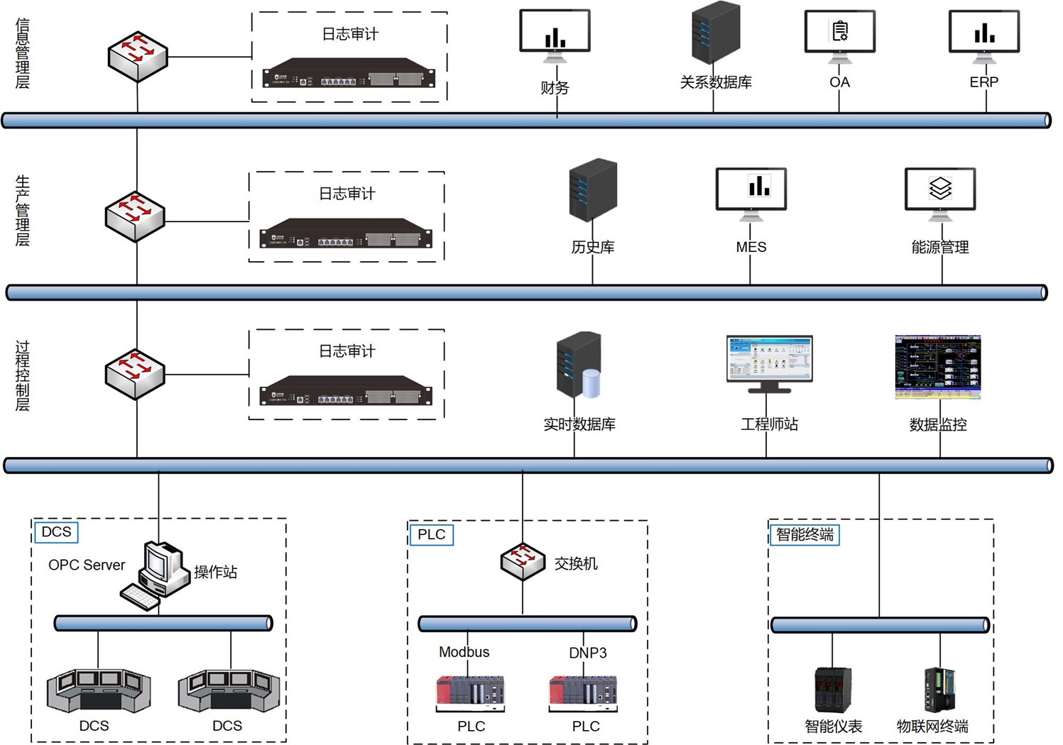 在信息管理層、生產(chǎn)管理層和過程控制層部署日志審計,通過收集并分析系統(tǒng)日志等數(shù)據(jù),從而發(fā)現(xiàn)違反安全策略的行為。安全審計主要側(cè)重于事后分析,即當(dāng)發(fā)生安全事故或者發(fā)生違反安全策略的行為之后,通過檢查、分析、比較審計系統(tǒng)收集的數(shù)據(jù),從中發(fā)現(xiàn)違反安全策略的行為。