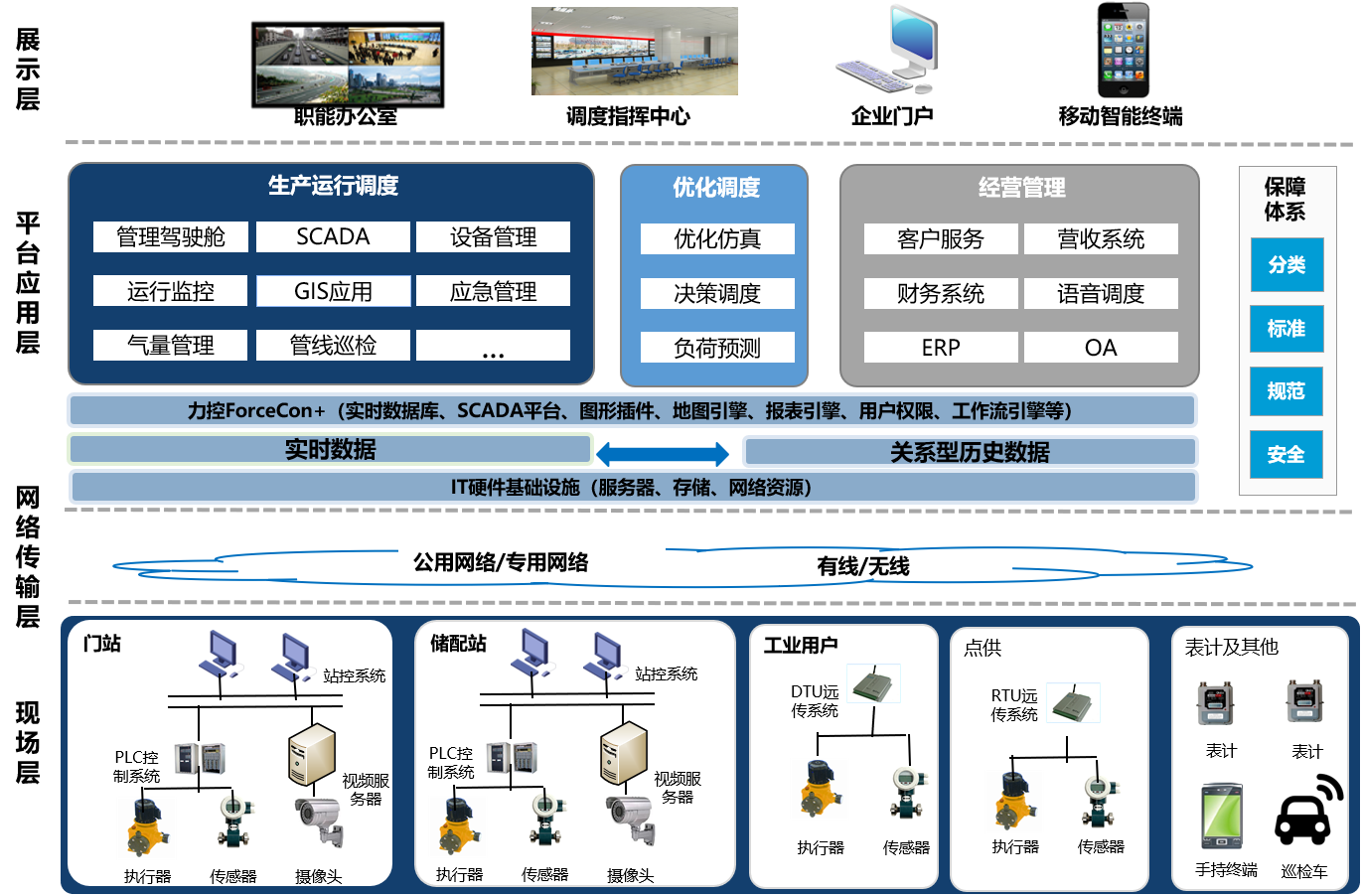 力控ForceCon+產品家族豐富的產品線構成了豐富工業互聯網解決方案,在企業管控一體化綜合集成層面,提供從自動化監控到生產信息化調度決策的企業管理與控制軟件及工控信息安全產品,構成完整的智能工廠縱向集成解決方案,實現企業生產調度指揮與在線智慧運營管理。